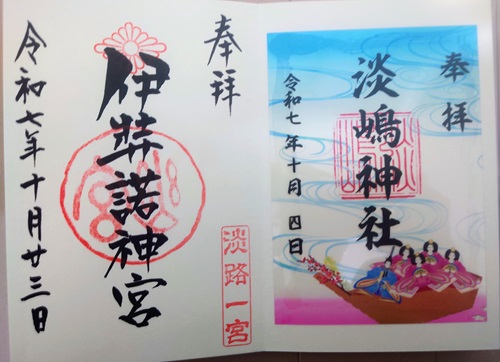 左側の御朱印が淡路市にある伊弉諾神宮です。
