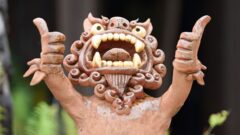 粘土でシーサー作りを体験後、焼いてもらっている間に